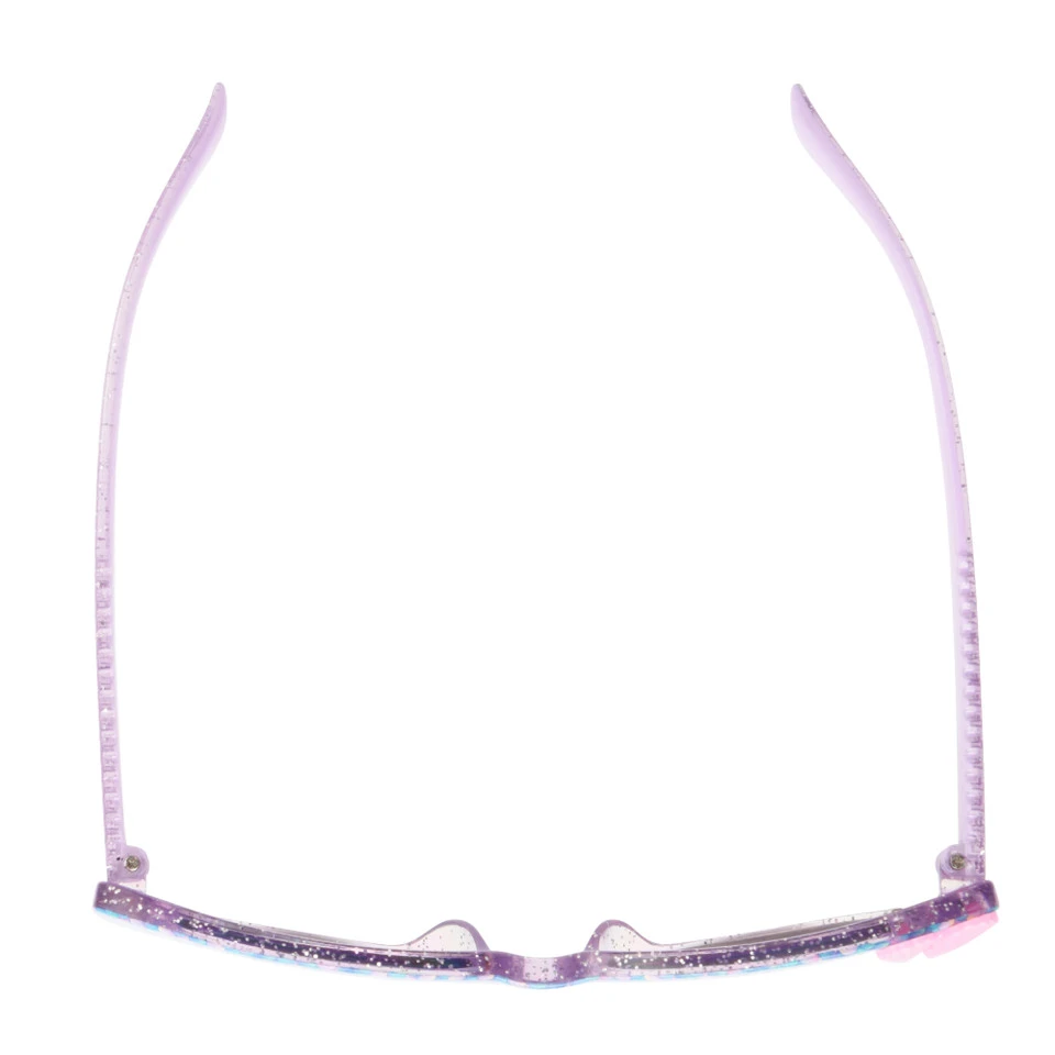 A sweet and shimmering style your little mer-person will love. 58871FGK500 kids’ sunglasses have a cat eye-shaped frame with an iridescent scale pattern and pearlized shell accents on the front, paired with light purple temples, one of them stamped with “be mer-mazing.” The purple mirror lenses provide 100% UVA-UVB protection and are resistant to scratches and impacts. Includes a pink case with white drawstring.