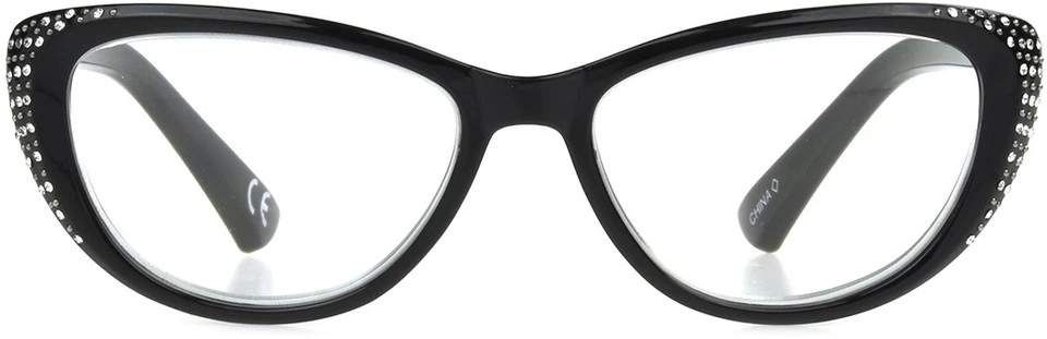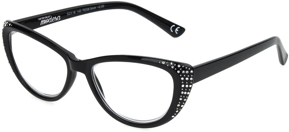 Introducing Darla, an unforgettable cat eye reader and part of Foster Grant’s Modera collection. Darla’s polished black frame is adorned with crystal accents on the cat eye corners.