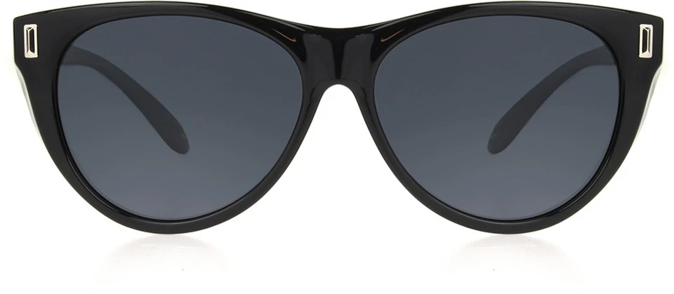 Solar Shield® Frissell Fits Over Sunglasses are made to wear over your eyeglasses or alone for instant polarized sun protection. This on-trend cat-eye shape in a black frame is a must have! Dark smoke lenses almost completely conceal your glasses underneath and are perfect for everyday use.