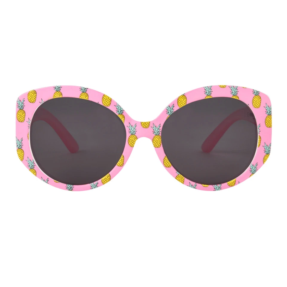 Tropical-inspired patterns abound in Monkey Monkey Honolulu polarized kids’ sunglasses. The oversized, round frame allows the graphic pattern to really shine (and the frame is made out of 50% recycled plastic*). The smoke grey lenses are resistant to scratches and impacts, provide 100% UVA-UVB protection and are polarized to reduce glare. Includes a Monkey Monkey pouch.
