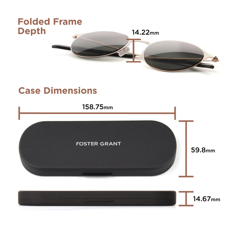 The line of Super Flat eyewear from Foster Grant® is ultra-compact and ultra-portable. These sunglasses are slim enough to fit in any purse or pocket when you’re on-the-go. And they function just as efficiently and fit just as comfortably as our standard-sized styles. Every Super Flat style includes a coordinating hard case that’s 59.8mm x 158.75mm x 14.67mm (2.35 in. x 6.25 in. x 0.58 in.).