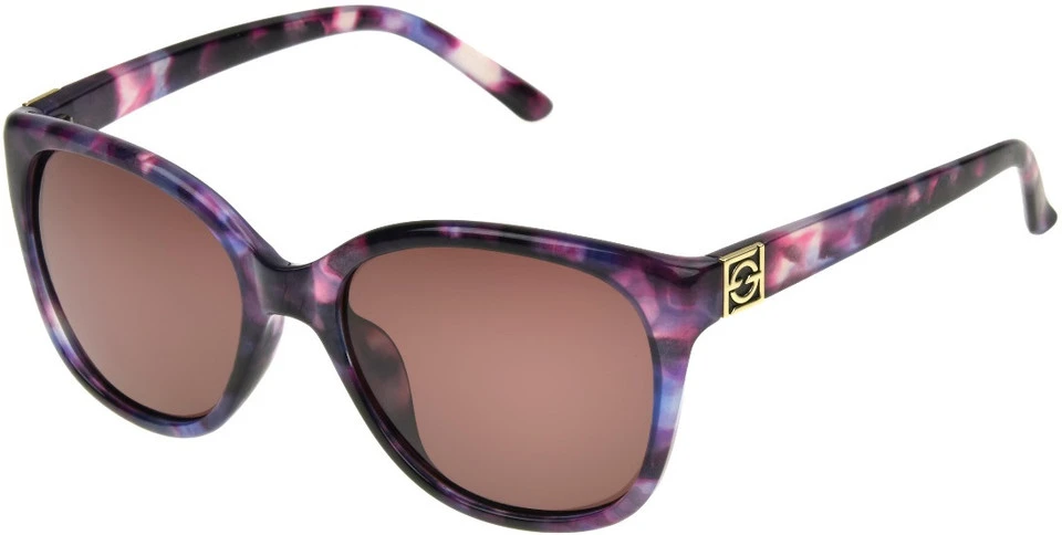 These striking purple and pink patterned frames wrap around a brown tinted polarized lens for a feminine and sophisticated look. Polarized lenses help reduce glare and increases contrast for enhanced visual clarity and comfort.