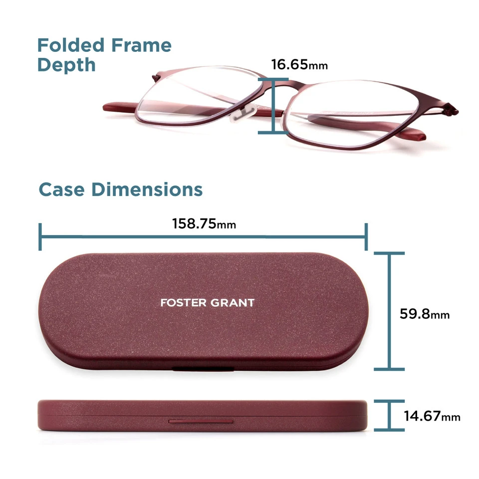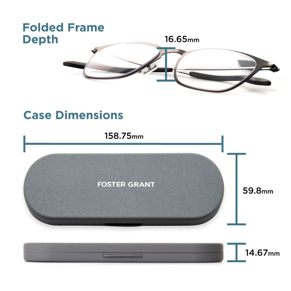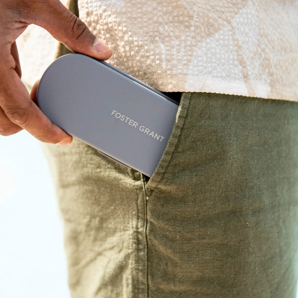 The line of Super Flat eyewear from Foster Grant® is ultra-compact and ultra-portable. These blue light glasses are slim enough to fit in any purse or pocket when you’re on-the-go. And they function just as efficiently and fit just as comfortably as our standard-sized styles. Every Super Flat style includes a coordinating hard case that’s 59.8mm x 158.75mm x 14.67mm (2.35 in. x 6.25 in. x 0.58 in.); this helps to make Liam even flatter than it is on its own.