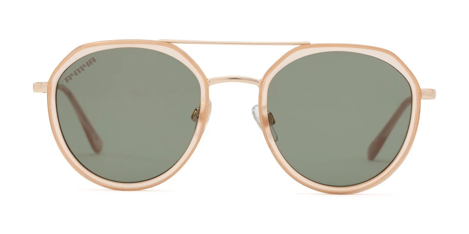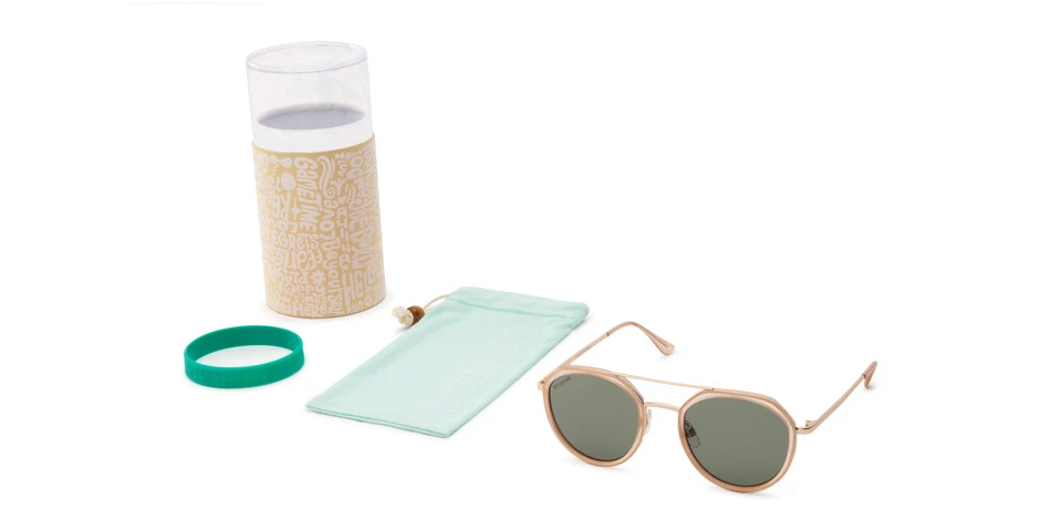 Go to your happy place with Peace Within sunglasses by Foster Grant. These cool sunnies express your sense of inner peace with a softened, modern take on classic aviators. Here, the aviator profile includes fronts and tips made out of translucent light nude plastic* and a matte gold-toned metal bridge and temples. The scratch-resistant lenses are green-smoke grey and offer 100% UVA-UVB protection. Comes with a mint green tensile pouch (marked with A4114A® — All For One, One For All) and coordinating Dynasty Green rubber bracelet in a reusable paper tube.
