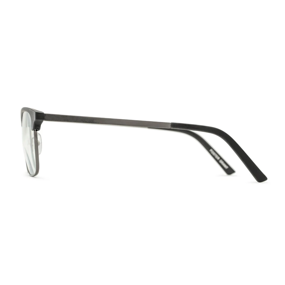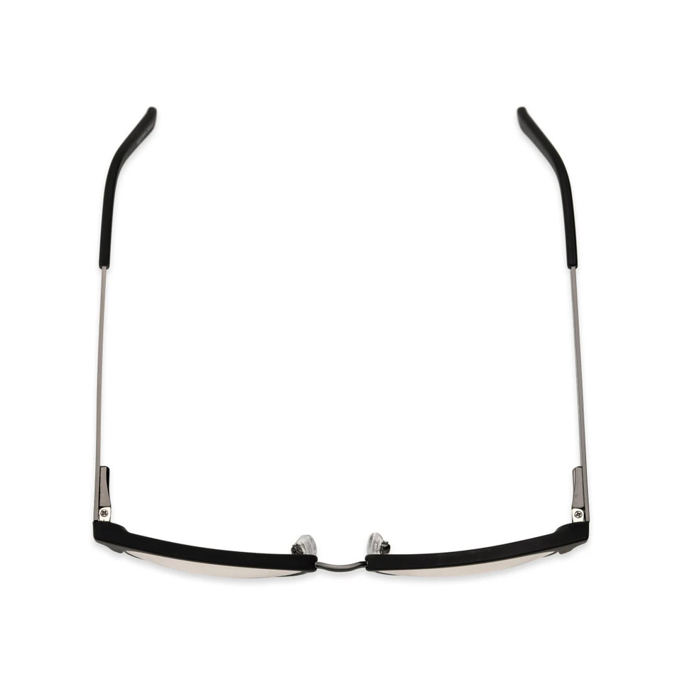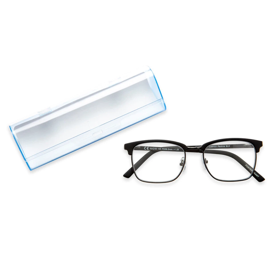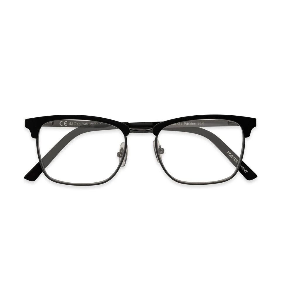 Perkins Pop of Power® Bifocal** Style reading glasses bring an air of retro cool to reading and other tasks. These reading glasses have a classic club frame made of satin dark gunmetal with matte rubberized black brows and tips. Adjustable nose pads and spring hinges offer you all-day comfort and security.