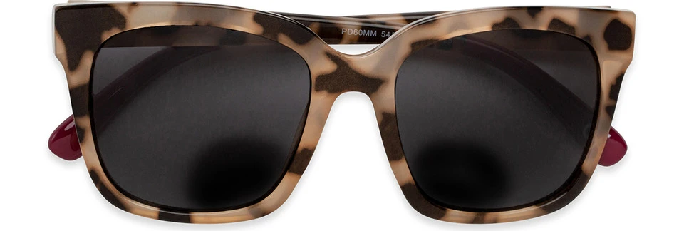 Sierra SunReaders® Reader Segment Style, part of the Sofia Vergara® x Foster Grant® collection, combine sophisticated style with focused reading magnification and comfort when out in the sun. They have a square frame made out of tan, tortoise-patterned plastic with berry-colored accents on the tips of the temples. The smoke grey lenses offer 100% UVA-UVB protection, and they have a magnified reader segment on the bottom for easier reading of small print. The rest of each lens is unmagnified for longer distance viewing. Includes a protective hard case.